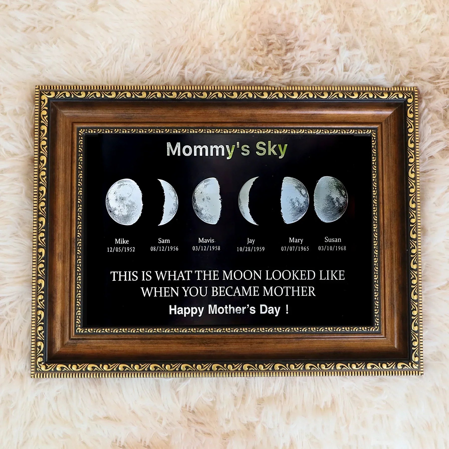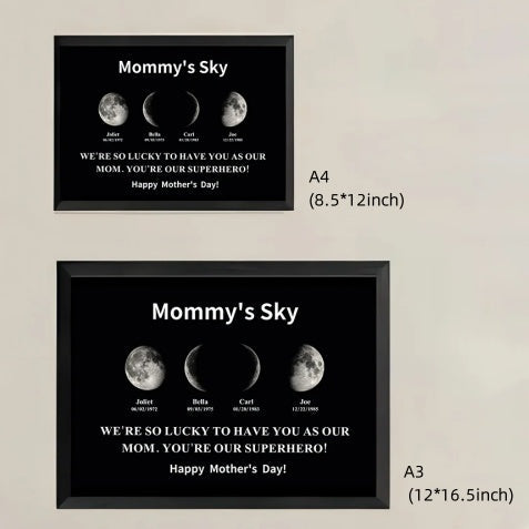 Explore the mesmerizing lunar cycles with our exclusive Mommy's Universe Art Frame. Delve into the enchanting dance of the moon,revealing eight unique phases each month. Encased in our exquisite frame, witness the celestial beauty of these phases.