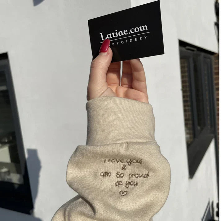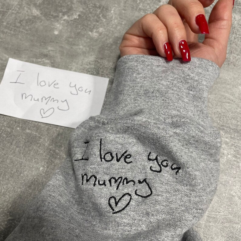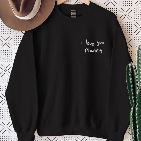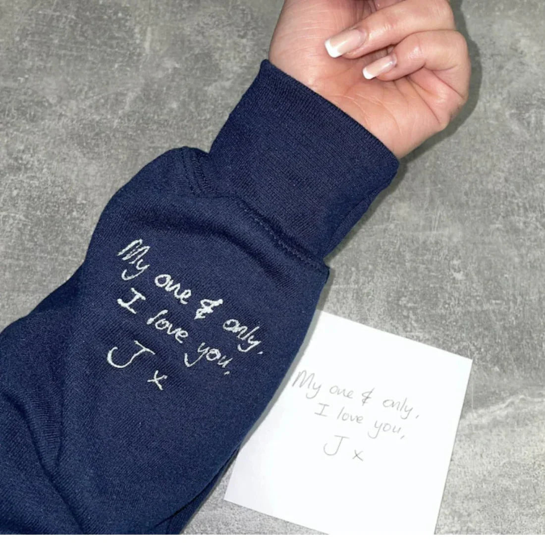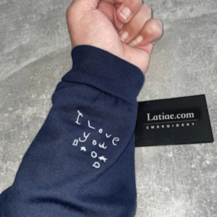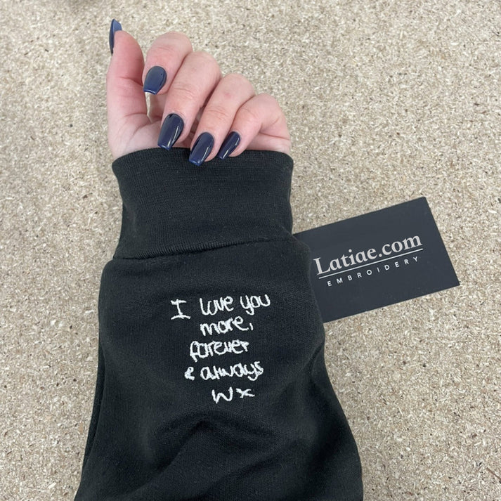 Turn treasured memories into wearable art with our Custom Handwriting Embroidered Apparel. Upload a photo of your loved one's handwriting or drawing, and we'll expertly embroider it onto your chosen item. The perfect personal touch for your wardrobe. Exclusively yours.